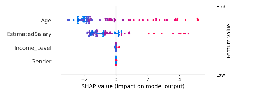 The base value (-1.94595714) represents the average log odds of a positive prediction (e.g., purchase) across the training set, indicating a bias toward “No” (negative class) before considering the features. The Age feature has the largest negative contribution (-2.42997232), strongly pushing the prediction toward “No.” This suggests that the customer’s age (scaled to 0.243902, likely in the Young Adult range) is associated with a lower likelihood of the target behavior, perhaps younger customers are less likely to purchase. Conversely, EstimatedSalary (0.882769337) has a positive contribution, pushing the prediction toward “Yes.” A scaled salary of 0.533333 (above average) indicates that higher salaries correlate with the target behavior, aligning with the intuition that wealthier customers may be more likely to buy. Gender and income level have minimal impacts (-0.000435 and -0.0209145568, respectively), suggesting they’re less influential for this specific prediction.
