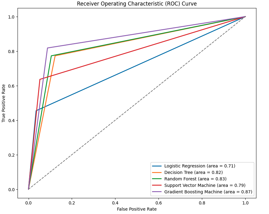 The Gradient Boosting model got the highest value of AUC (0.87), indicating it’s the best at distinguishing between classes (e.g. purchase vs no purchase). Its ROC curve is the one nearest to the top-left corner, indicative of a high TPR coupled with a low FPR. The Random Forest (AUC = 0.83) and Decision Tree (AUC = 0.82) models also have good predictive performance, probably because these models, especially tree-based models, are able to capture non-linear relationships, such as interaction between Age and EstimatedSalary. Logistic Regression (AUC = 0.71) achieves the worst performance, being a linear classifier, and as such does not account for the overall behavior of customers. The Support Vector Machine (AUC = 0.79) falls in the middle, possibly because its default kernel (e.g., linear or RBF) isn’t fully optimized for this dataset. The difference in AUCs underscores the need for testing multiple models, as tree-based methods appear to be better for this problem.