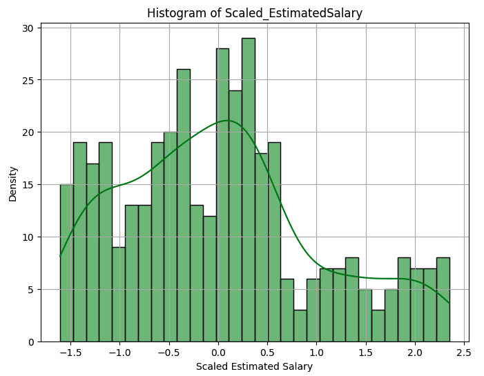 The histogram of Scaled_Age shows a roughly bell-shaped distribution with a peak around 0 but with multiple peaks (multimodal). The histogram of Scaled_EstimatedSalary also shows a multimodal distribution, with peaks around -0.5 and 0.5, and a long tail extending to the right. The Scaled_EstimatedSalary histogram’s peaks indicate the clustering of salaries, possibly due to common salary bands (e.g., entry-level, mid-tier, executive). The right tail in Scaled_EstimatedSalary suggests a few customers with significantly higher salaries, indicating potential outliers that could influence the model if not addressed.