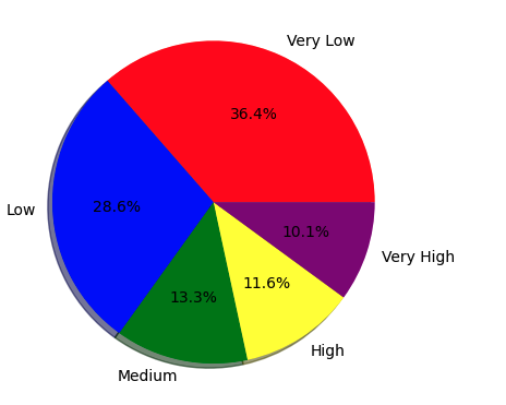 The Young Adult group is the most dominant group (48.3% of the data), which indicates that the dataset is perhaps biased toward younger customers, due to the business focusing more on them (e.g. a tech/lifestyle product). Also, the relatively similar split between middle-aged and Senior Adult groups indicates a balanced representation of older customers, but their smaller proportions could also make this model less generalizable for these groups if not approached carefully. This tells us that we might want to implement balancing techniques or stratified sampling during the train-test split to ensure all age groups are adequately represented. - Income Level Distribution: Another pie chart breaks down the income feature into categories: Very Low, Low, Medium, High, and Very High. The distribution is shown below;